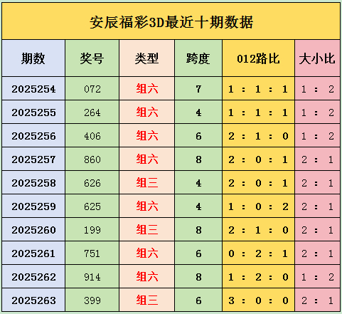 一、类型分析:上期开出奖号399,为组三类型,最近十期组六类型奖号共出现7次,分别开出072 264 406 860 625 751 914。其中组三号码出现3次.。综合分析,组六类型较热,本期预计开出组六号码。