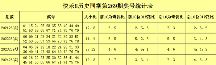 大小比分析:在历年第269期同期开奖中,奖号大小总比例为43:37,大号走势相对较热,去年同期号码大小比为12:8,大号表现较热,今年第269期同期适当关注小 号回补,预计在中点附近出现,推荐大小比9:11。
